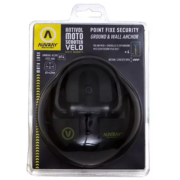 Asegura tu motocicleta, scooter, remolque o caravana con lo último en seguridad estacionaria: el Anclaje de Pared y Suelo AUVRAY. Este anclaje de alta resistencia proporciona un punto de bloqueo permanente en su garaje o plaza de aparcamiento.
