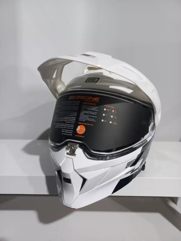 Estás preparado para una nueva aventura? El casco convertible Origine Adventure es muy versátil, ya que se transforma de un casco de trail abatible a un casco modular tradicional en segundos, además incluye una gafa de sol integrada. De este modo podemos circular sin miedo al viento, la suciedad o al sol. Los cascos Origine Adventure tiene un diseño muy original e innovador. La calota es ligera y está construida en material termoplástico avanzado. Todos los cascos Origine son homologados ECE