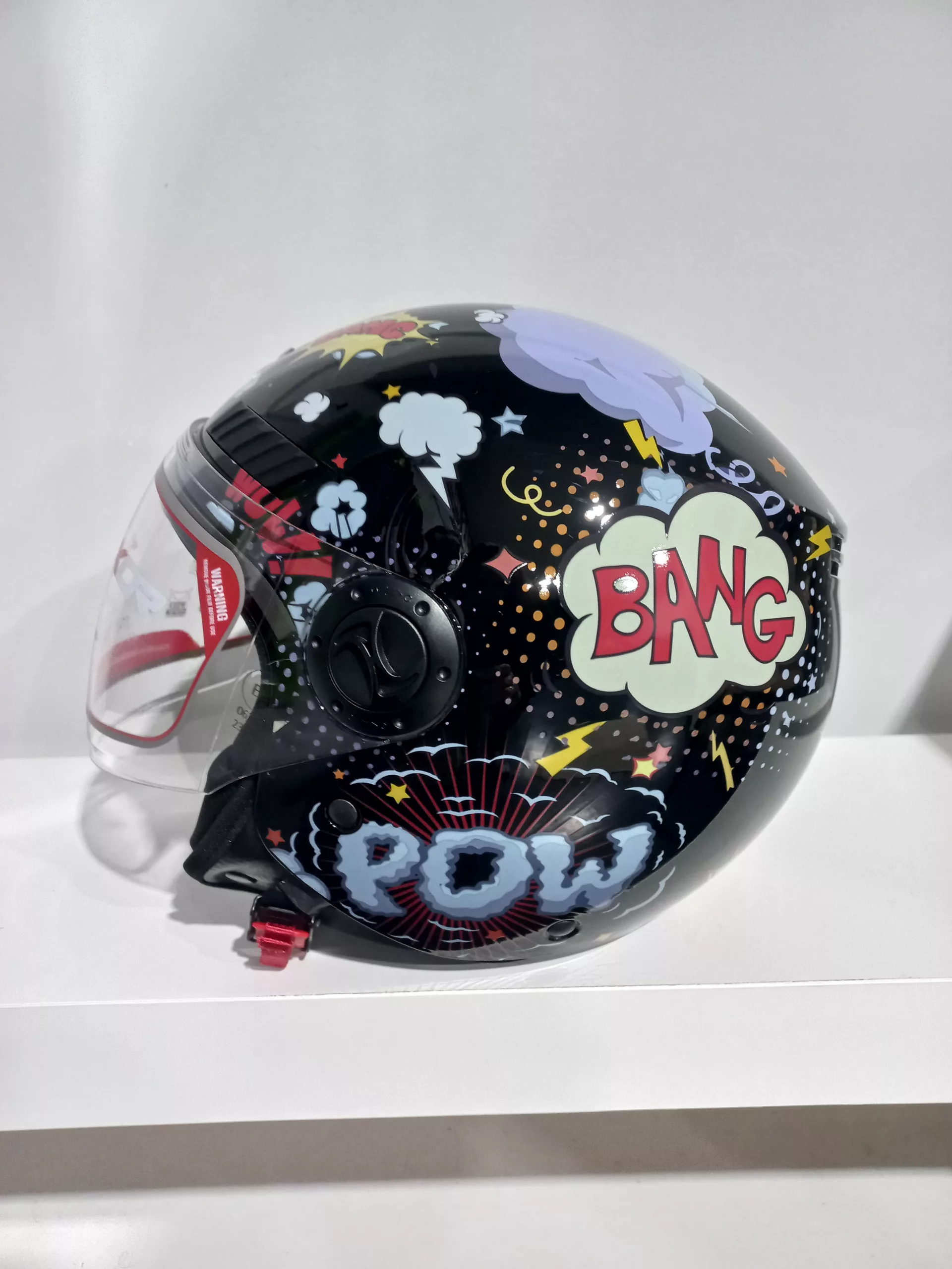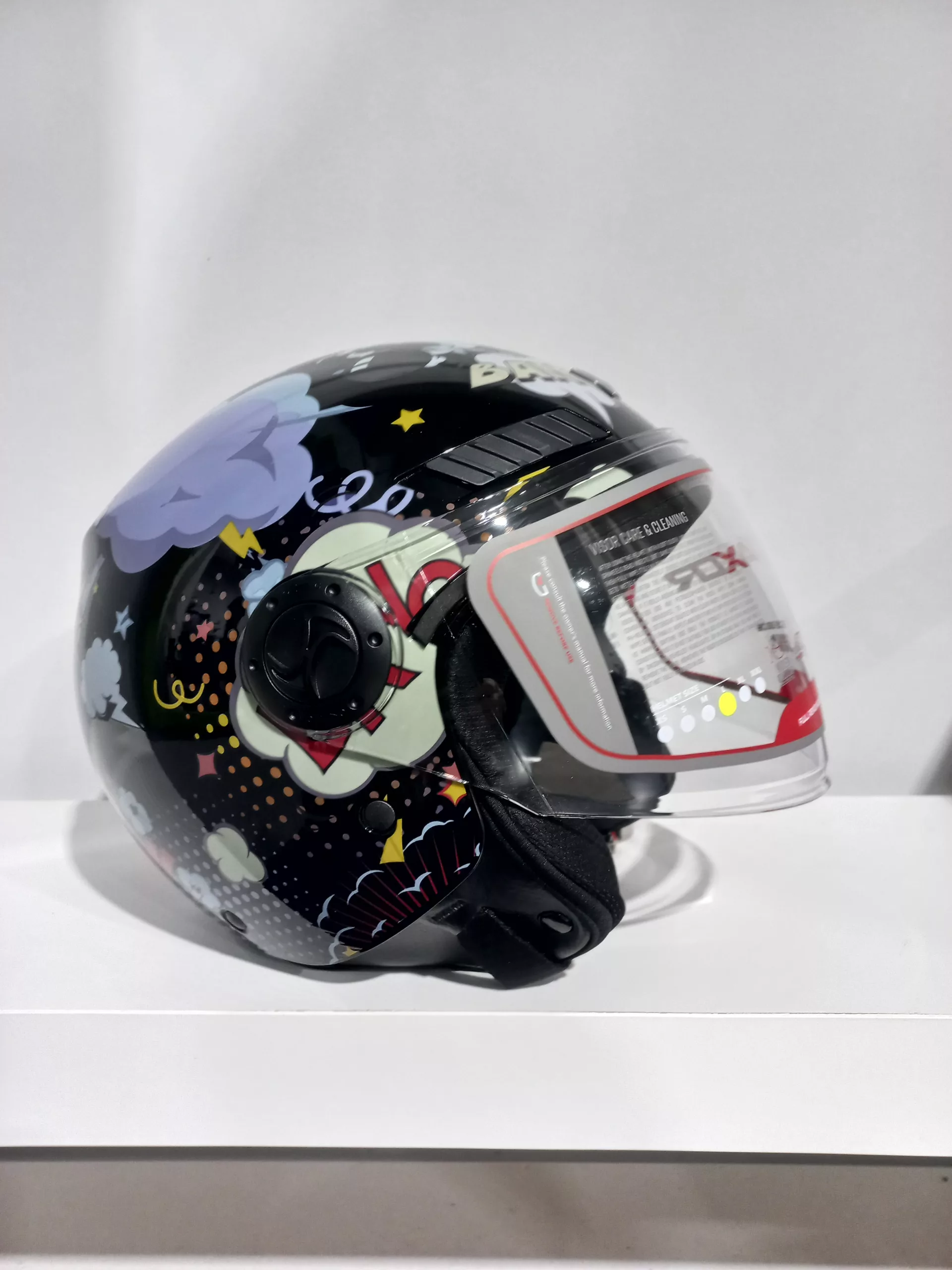 SHIRO HELMETS Casco Jet infantil Modelo Kioto Boom. Casco ligero y cómodo para scooter o moto de carretera, muy cómodo para trayectos urbanos. Casco Jet con dibujos, pantalla transparente, color negro para niño o niña.