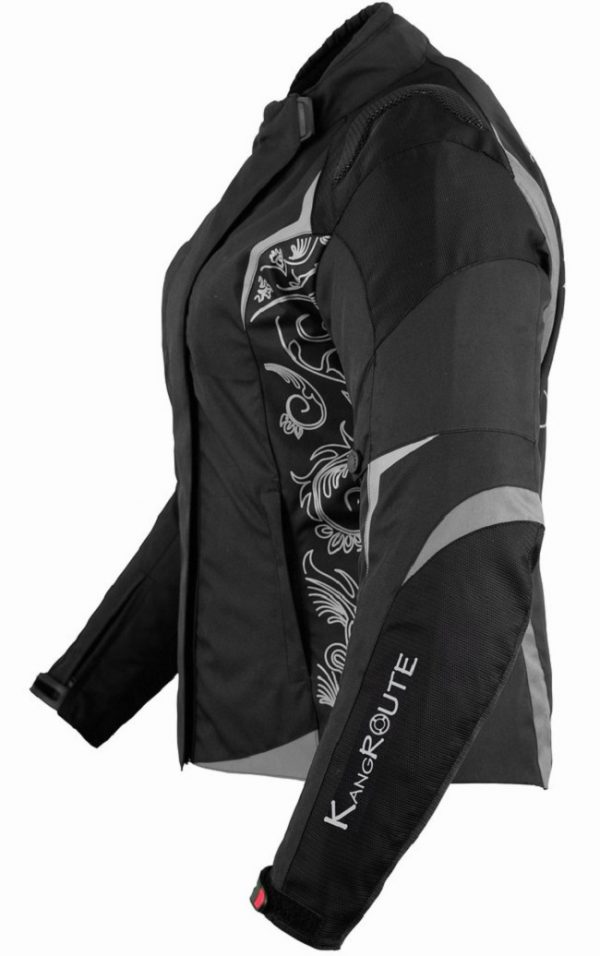 Chaqueta de cordura para mujer con protecciones homologadas CE y desmontables en codos, hombros, espalda y forro térmico desmontable. Chaqueta moto mujer invierno corta barata negro gris plata Kangroute.