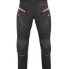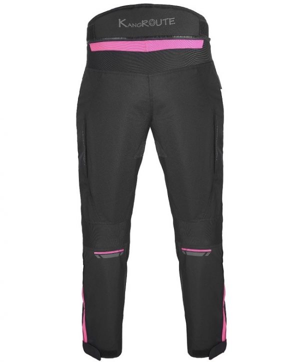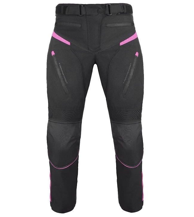 PANTALÓN TOURING MOTO PARA CHICAS, COLOR NEGRO Y ROSA FUCSIA, CONFECCIONADO CON TEJIDO DE ALTA RESISTENCIA. MEMBRANA IMPERMEABLE Y TRANSPIRABLE CON REISSA Y FORRO TÉRMICO DESMONTABLE. 100% IMPERMEABLE Y APTO PARA INVIERNO Y VERANO. VENTILADO EN LA PARTE DELANTERA Y TRASERA PARA UNA MAYOR TRANSPIRACIÓN. PANTALÓN MOTO MUJER INVIERNO CORDURA CON PROTECCIONES BARATO KANGROUTE.