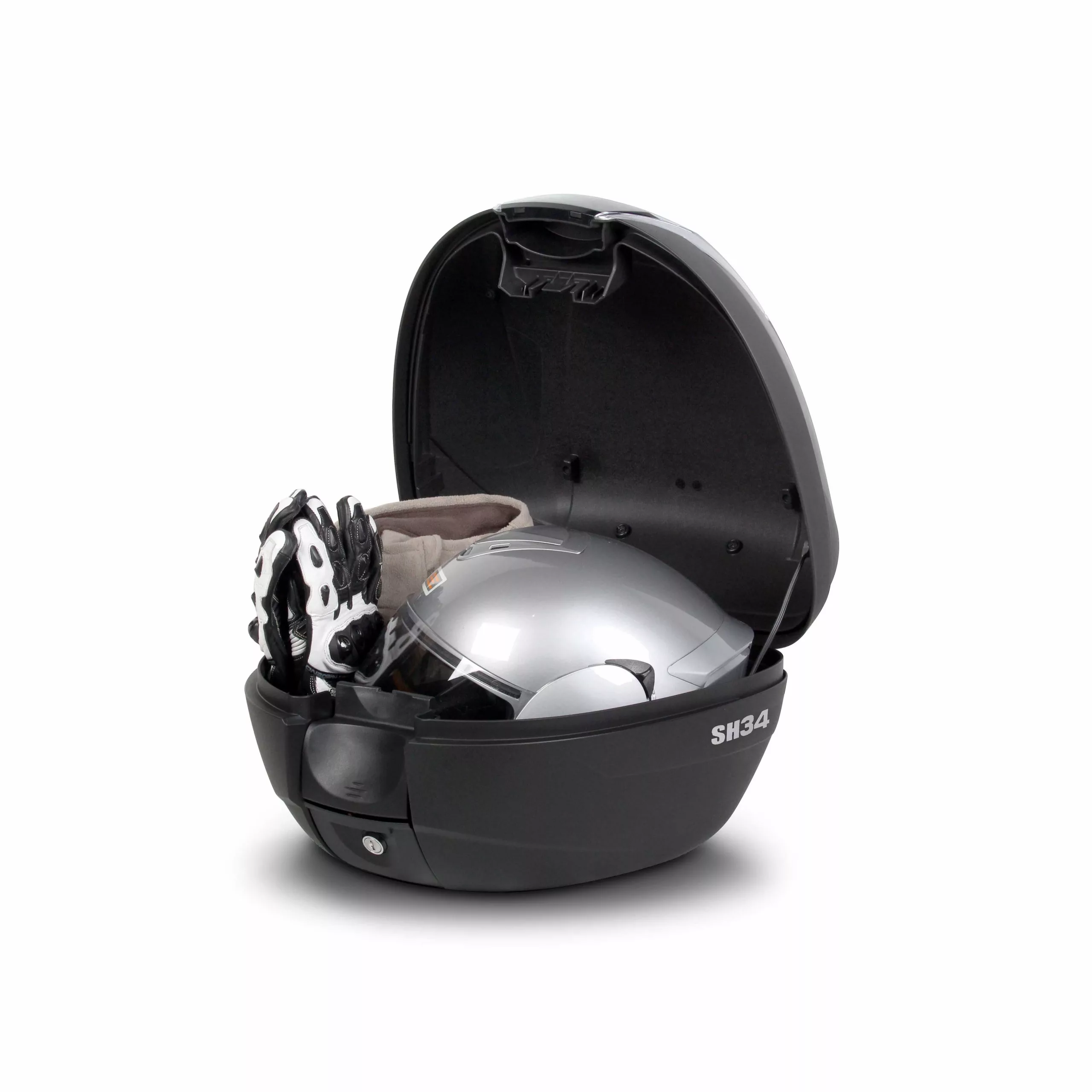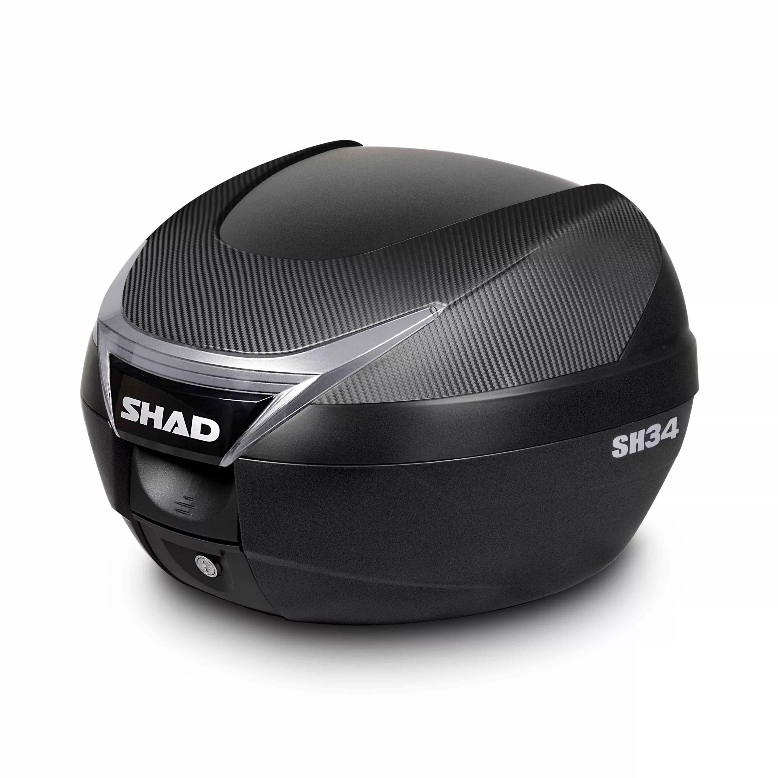 El baúl SH34 tiene capacidad para 1 casco integral + extras, perfecto para scooters o motos pequeñas. Incluye el sistema «Press Lock System», tapa de carbono y parrilla de montaje.